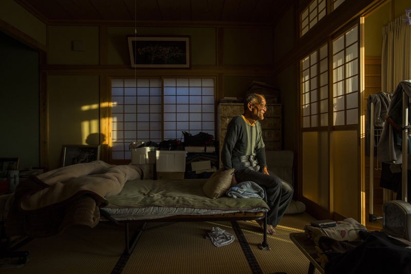 Naoshi Sato, a lumberjack and farmer whose son, Shoichi, was killed in the tsunami, looks outside from his bedroom of his rebuilt home at sunrise in Kesen, October 26, 2016. Naoshi intended to restore the community back to the way it was. For a year, he camped in the wreckage of his home. For a decade, he has dreamed of Kesen’s rebirth. He cut trees from a mountain and rebuilt his home in 2012, the first one in the area. When only two villagers followed his lead, Naoshi’s wife and daughter-in-law realized the futility of his plan and left him behind.
