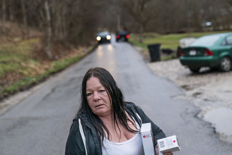 Yvonne Ash carries back to her house a CPR kit and a supply of the overdose reversal medication naloxone after a visit from the Quick Response team, which visits everyone who overdoses to offer help, Monday, March 15, 2021, in Branchland, W.Va., just days after Ash’s son overdosed, “We need help,” Ash said. People have been dying all around her. Her nephew. Her neighbors. Then, almost, her son. “People I’ve known all my life since I was born, it takes both hands count them,” she said. “In the last six months, they’re gone.”