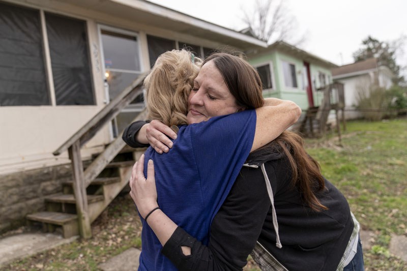 Sarah Kelly, right, is embraced by Sue Howland, with the Quick Response Team, after Howland presented her with a coin marking Kelly’s one-year anniversary in recovery, outside her home in Guyandotte, W.Va., Wednesday, March 17, 2021. After struggling with opioid addiction most of her life, Kelly white-knuckled her way through the pandemic. “I didn’t know where to stop and pick up the pieces. It felt like the task was too overwhelming to get out of the mess I made,” she said. “How do you come back from this?” But she did, and it feels to her like a miracle.