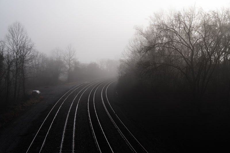 A police patrol vehicle sits along a stretch of railroad tracks in Huntington, W.Va., Wednesday, March 17, 2021. Huntington was once a thriving industrial town of almost 100,000 people. It sits at the corner of West Virginia, Kentucky and Ohio, and the railroad tracks through town used to rumble all day from trains packed with coal. Then the coal industry collapsed, and the trains don’t come so much anymore.