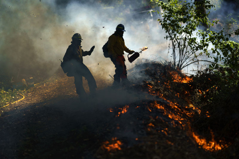 Stoney Timmons, right, a member of the Robinson Rancheria Pomo Indians, uses a torch to light the ground on fire as Spencer Proffit, with the Bureau of Land Management, looks on during a cultural training burn in Weitchpec, Calif., Tuesday, Oct. 5, 2021. Timmons said his tribe wants to host its own training session next year. “I'm getting some good lessons to take back,” he said.