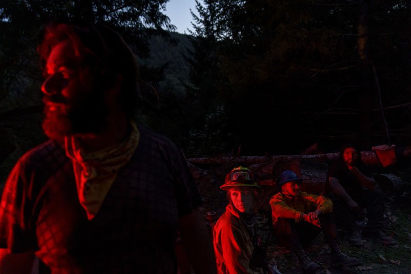 Max Brotman, from left and Rhodri Wiseman, rest along with Robinson Rancheria Pomo Indians Eric Timmons and his brother, Stoney Timmons, after they finished working a cultural training burn on the Yurok reservation in Weitchpec, Calif., Thursday, Oct. 7, 2021.