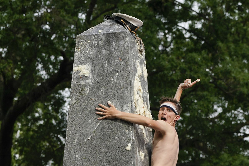 CAPTION: Midshipman 4th Class Michael Lancaster, 19, of Signal Hill, Tenn., reacts after placing a dixie cup cap atop of the Herndon Monument during the Herndon Monument Climb at the U.S. Naval Academy, Saturday, May 22, 2021, in Annapolis, Md.