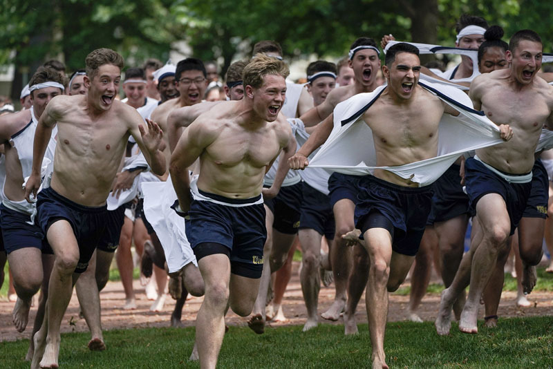 Midshipmen 4th Class from the 14th Company rip their shirts as they run toward the Herndon Monument during the Herndon Monument Climb at the U.S. Naval Academy, Saturday, May 22, 2021, in Annapolis, Md.