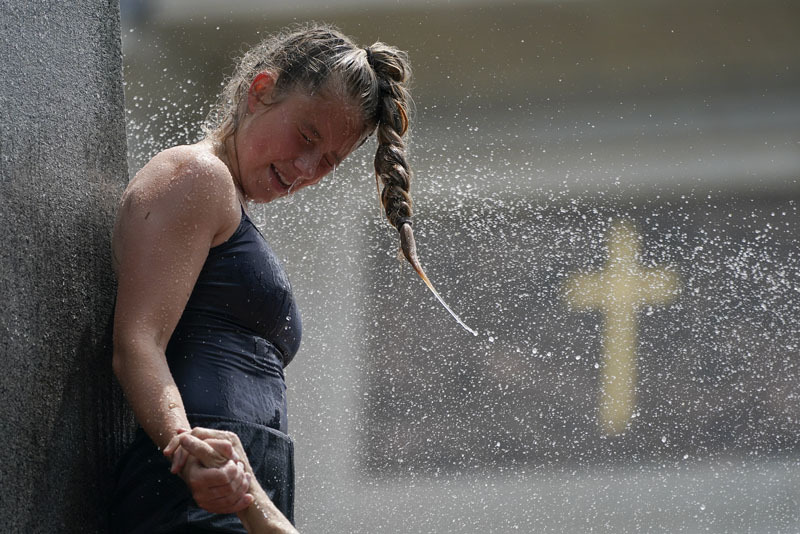 Midshipwoman 4th Class Aubin Hattendorf, of Arlington, Tex., and a member of the 21st Company, is sprayed by upperclassmen as she helps a classmate climb the Herndon Monument during the Herndon Monument Climb at the U.S. Naval Academy, Saturday, May 22, 2021, in Annapolis, Md.