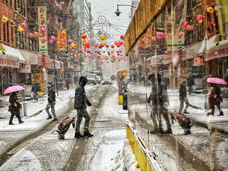 People cross Mott Street in Chinatown in the snow during Lunar New Year.