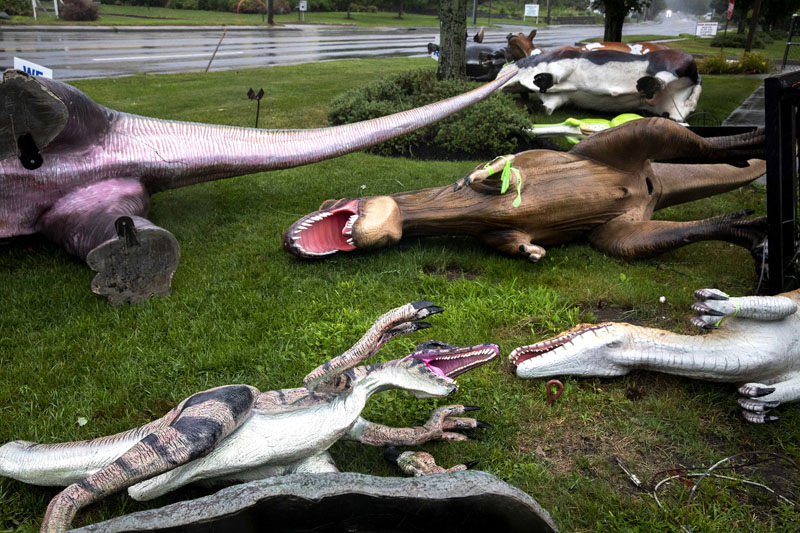 WESTHAMPTON, NY - AUGUST 22, 2021: Dinosaurs are placed on their sides outside Life Size Statues, 1547 County Rd. 39 in Southhampton, NY on eastern Long Island, as communities across the Northeast United States brace for Hurricane Henri, later downgraded to a Tropical Storm, to make landfall, August 22, 2021.