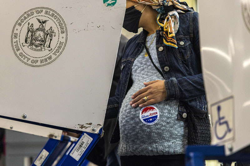 Priscilla Mousa, who is pregnant, casts a ballot in New York City’s mayoral election at a polling station in the Bronx, New York, on the Election Day, November 02, 2021. She put a sticker saying "I am a Future Voter" on her belly. The Democratic candidate, Eric Adams, won handily, but his party was left reeling from startling losses statewide.