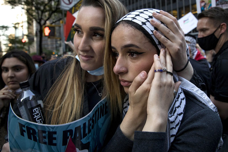 NEW YORK, NY - MAY 18, 2021: Nora Yafaie, 17 of Yonkers, right, is comforted by Edona Ismaili, 24 of Staten Island, near the 17th Precinct at 167 East 51st St. in Manhattan while waiting on news of a friend who was arrested protesting the ongoing battle in Gaza between Hamas and Israel, May 18, 2021. According to the United Nations, 260 people were killed in Gaza and at least 12 were killed in Israel during the brief war which lasted over 10 days.