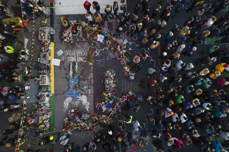 A crowd is seen next to the spot where George Floyd was murdered at George Floyd Square after a guilty verdict was announced at the trial of former Minneapolis police Officer Derek Chauvin for the 2020 death of Floyd, Tuesday, April 20, 2021, in Minneapolis. Former Minneapolis police Officer Derek Chauvin has been convicted of murder and manslaughter in the death of Floyd.