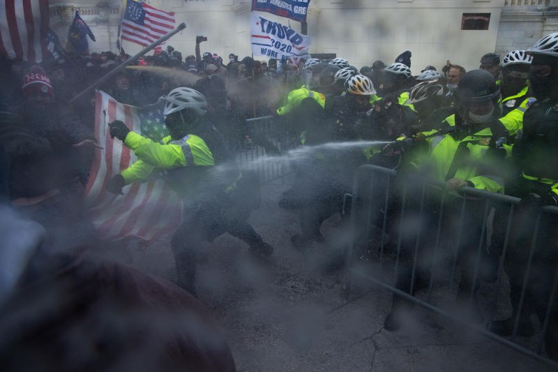Supporters of Donald Trump fight with law enforcement amidst clouds of pepper spray outside the United States Capitol during the Capitol Riot in Washington DC. January 06 2021. Five people died during the attack on the US Capitol as supporters of Donald Trump sought to overturn his defeat in the 2020 presidential election.