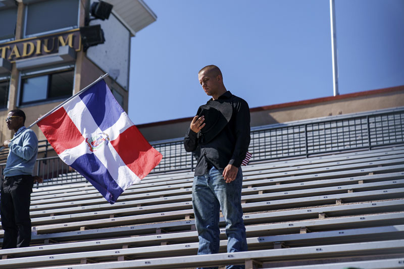 A mourner bows his head during a public wake for Sgt. Johanny Rosario Pichardo, a U.S. Marine who was among 13 service members killed in a suicide bombing in Afghanistan, at Veterans Memorial Stadium in her hometown of Lawrence, Mass., Tuesday, Sept. 14, 2021.
