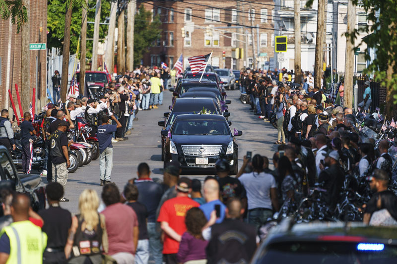Motorcyclists line the route to the cemetery as the procession carrying the casket of Sgt. Johanny Rosario Pichardo, a U.S. Marine who was among 13 service members killed in a suicide bombing in Afghanistan, makes its way to the burial service in Lawrence, Mass., Tuesday, Sept. 14, 2021.