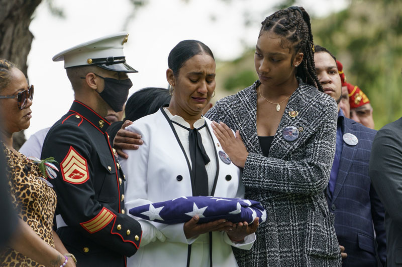 Colasa Pichardo, center, is comforted by her daughter, Rosalinda Rosario, after she is presented with the American flag off the casket of her daughter, Sgt. Johanny Rosario Pichardo, a U.S. Marine who was among 13 service members killed in a suicide bombing in Afghanistan, during her burial service in Lawrence, Mass., Tuesday, Sept. 14, 2021.