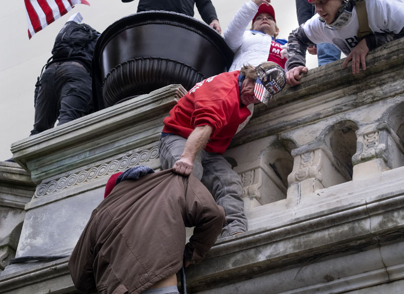 Supporters of President Donald Trump ascend a wall as they hold their ground after storming the United States Capitol in Washington, D.C., Wednesday, Jan. 6, 2020, as they protest the electoral college certification of President-Elect Joe Biden.