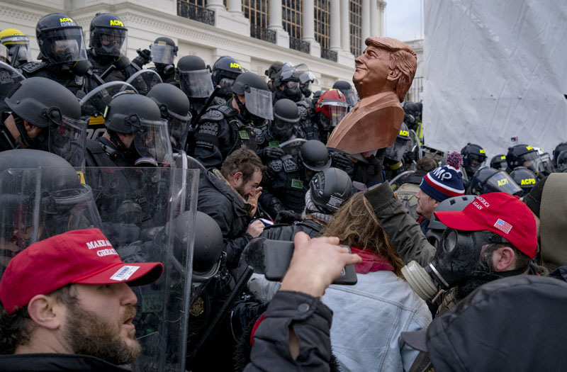 Trump supporters, one carrying a bust of Trump, face off south police on the steps of the United State Capitol in Washington, D.C., Wednesday, Jan. 6, 2020, as they protest the electoral college certification of President-Elect Joe Biden.