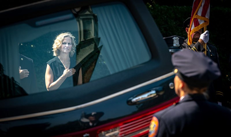 Nassau County executive Laura Curran watches the body of police officer Matthew Perlungher leaves Garden City Community Church in Garden City Wednesday Aug. 11, 2021
