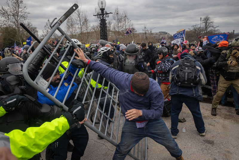 Supporters of Donald Trump fight with law enforcement outside the United States Capitol during the Capitol Riot in Washington DC. January 06 2021. Five people died during the attack on the US Capitol as supporters of Donald Trump sought to overturn his defeat in the 2020 presidential election.