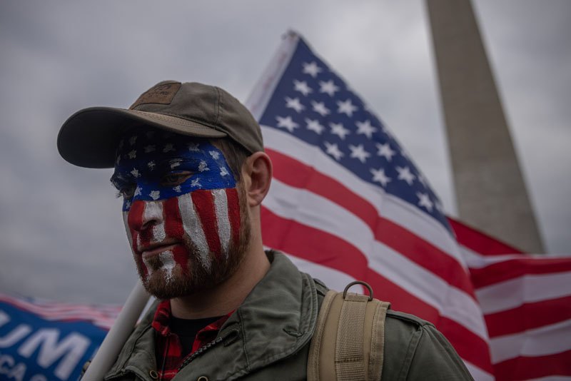 A supporter of Donald Trump, with his face painted with the American flag, stands by the Washington Monument before the Capitol Riot at the United States Capitol, Washington DC. January 06 2021. Five people died during the attack on the US Capitol as supporters of Donald Trump sought to overturn his defeat in the 2020 presidential election.