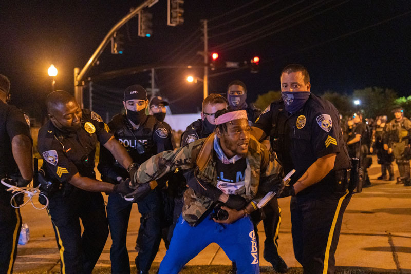 Law enforcement make arrests as people peacefully protest and defy curfew in Elizabeth City, North Carolina. 28 April 2021. A judge today denied a request for the body cam footage to be released to the public.