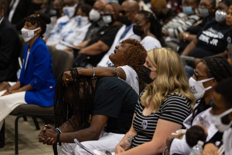 Martha McMullen (Aunt of Andrew Brown) reacts with Antron Brown (brother of Andrew Brown) as the family of Andrew Brown Jr, Reverend Al Sharpton, Civil Rights attorney Ben Crump attend the funeral of Andrew Brown Jr. at the Fountain of Life Church in Elizabeth City, North Carolina. 03 May 2021. Andrew Brown Jr. was fatally shot dead by Pasquotank County Sheriff’s deputies.