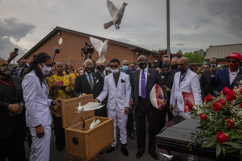The family of Andrew Brown Jr, Reverend Al Sharpton, Civil Rights attorney Ben Crump watch as doves are released at the funeral of Andrew Brown Jr. at the Fountain of Life Church in Elizabeth City, North Carolina. 03 May 2021. Andrew Brown Jr. was fatally shot dead by Pasquotank County Sheriff’s deputies.