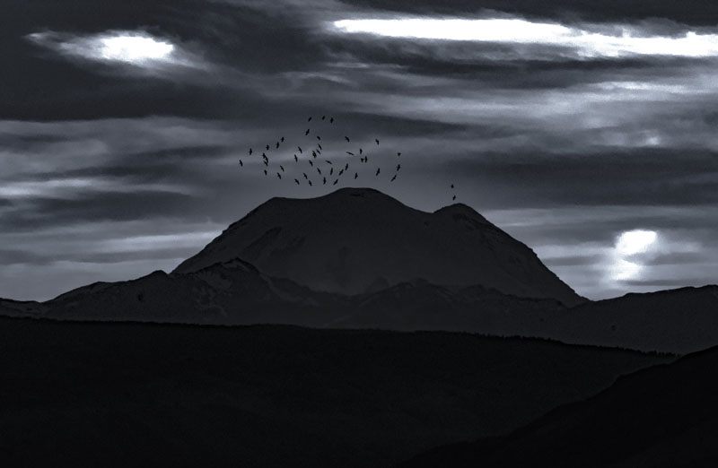 Birds circle in front of Mount Rainier just after sunset near Yakima, Washington, June 24, 2021. Photo Ray Stubblebine/Independent