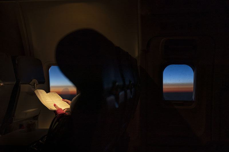 A passenger reads a book on an airplane while the sun sets on the horizon during a flight from Providence, R.I. to Orlando, Fla., Wednesday, April 21, 2021.