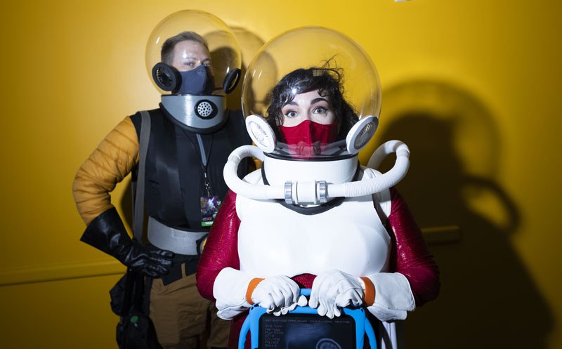 A couple poses for a portrait in costumes they designed themselves at the 2021 New York Comic Con at the Jacob K. Javits Convention Center in New York, New York, USA, 07 October 2021.