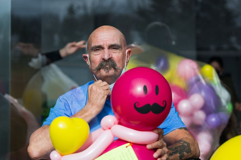 John Cianci of Old Bethpage, 70, pulls his mask down to reveal that he has a mustache similar to that of the "Balloon Buddy" that he received at the Excel Rehabilitation and Nursing facility in Woodbury Wednesday, Feb. 3, 2021. More than 100 "Balloon Buddies" were made by Amanda Johnson of Balloons by Amanda as part of the Adopt a Grandparent Balloon Buddy campaign and distributed at the facility Wednesday.
