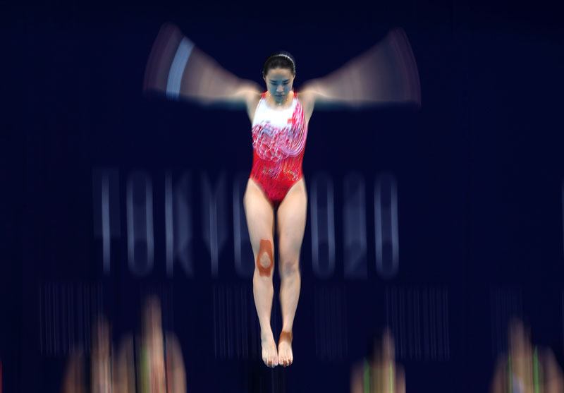TOKYO, JAPAN - JULY 25: Han Wang of Team China warms up ahead of the Women's 3m Springboard Finals on day two of the Tokyo 2020 Olympic Games at Tokyo Aquatics Centre on July 25, 2021 in Tokyo, Japan.