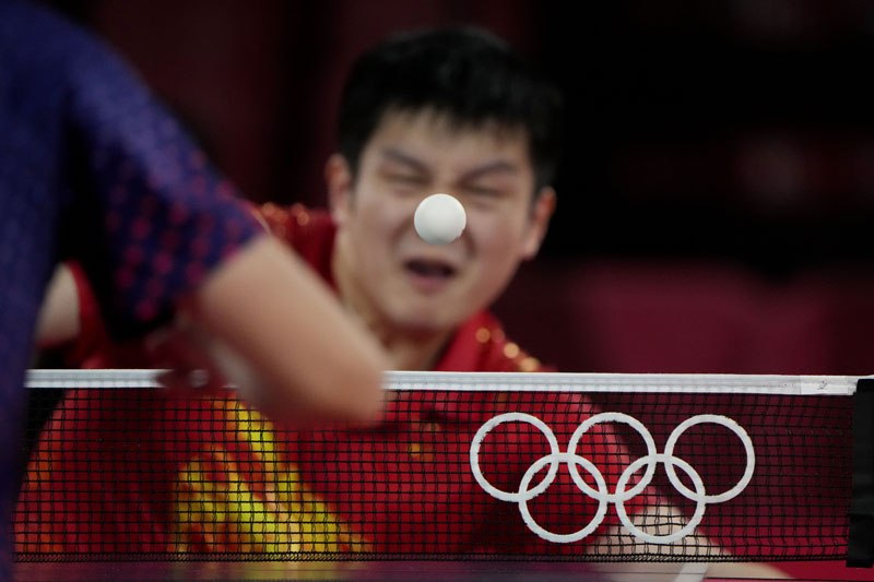 China's Fan Zhendong, right, competes against Taiwan's Lin Yun-Ju during the table tennis men's singles semifinal at the 2020 Summer Olympics, Thursday, July 29, 2021, in Tokyo.
