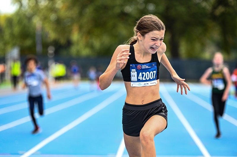 A Rising New York Road Runner member heads to the finish line during races at Icahn Stadium 10/16/21. NYRR promotes youth events throughout the year.