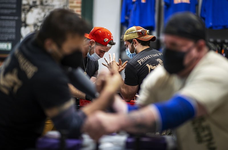 BAYSHORE, NEW YORK - MAY 1: Jacob Smith works with Elias Schamma during an Urban Arm Wrestling League demonstration training session at DICK'S Sporting goods Store on May 1, 2021 in Bayshore, New York. Gerren Nixon, 44, of Wyandanch, formed the Urban Arm Wrestling League, a company that sponsors tournaments and promotes the sport on Long Island, in 2019. He has been a fan of the sport since he saw the Sylvester Stallone movie "Over the Top" in the 1980's. Arm wrestling is popular around the world, particularly in Eastern Europe, but it remains a largely underground event in the United States, with few sponsors and no television coverage of tournaments. The team is a multicultural combined group of Men and Women. Nixon said there are very few arm wrestlers of color and he believes he’s the only Black arm wrestling league owner. He is working to build a network of local teams to compete across the country and it is a dream of his to be able to one day crown a homegrown champion from Long Island.