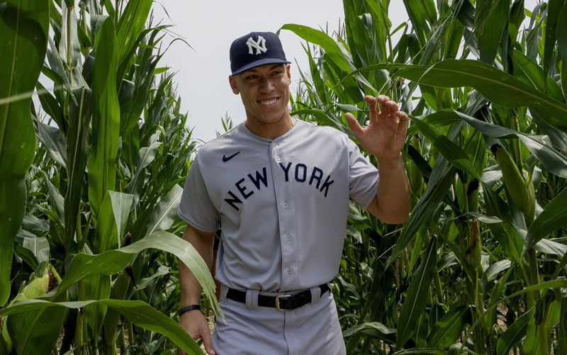 New York Yankees Aaron Judge walks through the cornfield from the movie set "Field of Dreams" ballpark as he gets ready for a game against the Chicago White Sox at an adjacent MLB Field of Dreams cornfield ballpark in Dyersville, Iowa on Thursday, August 12, 2021.