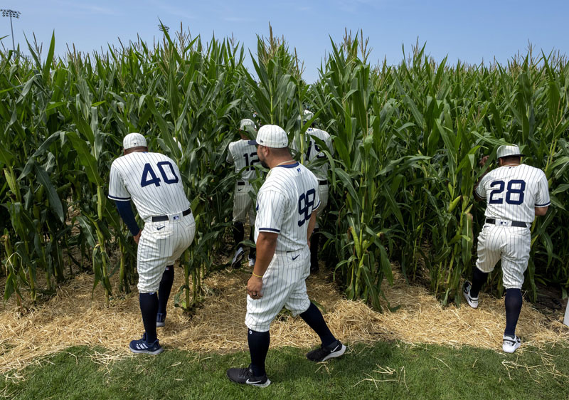 Chicago White Sox players "disappear" as they walk through the centerfield cornfield as they leave the 1989 movie set ballpark of the "Field of Dreams" to get ready for the game at an adjacent MLB Field of Dreams cornfield ballpark in Dyersville, Iowa on Thursday, August 12, 2021.