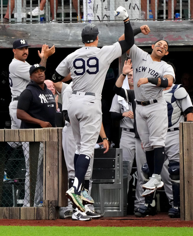 New York Yankees' Aaron Judge (99) celebrates with Rougned Odor (12) after a three-run homer against the Chicago White Sox during the third inning of the MLB Field of Dreams Game in Dyersville, Iowa, Thursday, August 12, 2021.