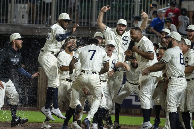 Chicago White Sox shortstop Tim Anderson (7) is surrounded by jubilant teammates as he touches home to celebrates a two-run walk-off home run and a 9-8 win over the New York Yankees during the ninth inning of the MLB Field of Dreams Game in Dyersville, Iowa, Thursday, August 12, 2021.
