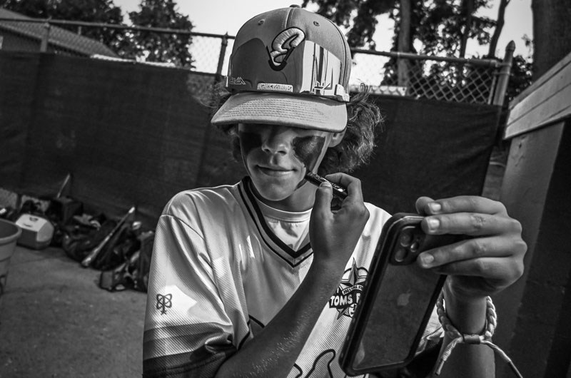 THE ROAD TO WILLIAMSPORT - The Toms River Little League Team, an historic powerhouse, pushed their way to the finals for a seed in the Little League World Series. — Here, Dominik Sabatino #1 uses his cellphone to view himself as he puts on black to help with glare before the game when Toms River played Point Beach in their little league bout Monday, July 19, 2021, in Trenton, NJ.