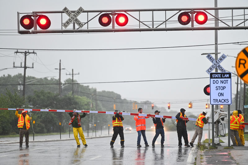 Long Island Rail Road workers try to free a downed track crossing blocking William Floyd Parkway in Shirley as Tropical Storm Henri drops rain across Long Island, Sunday, Aug. 22, 2021.