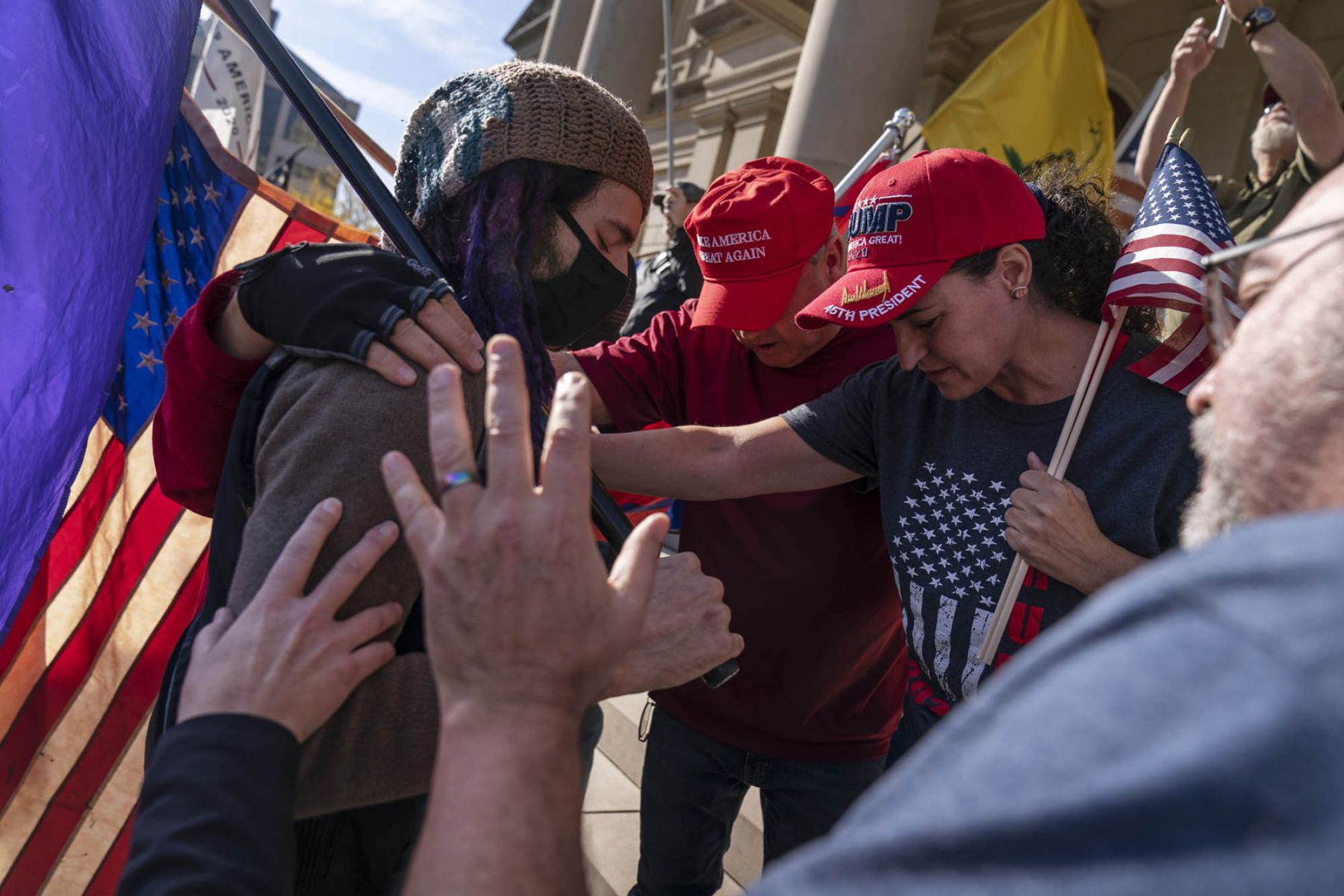 Trump supporters demonstrating the election results, at right, pray with a counter protester after the election was called for Biden outside the State Capitol in Lansing, Mich., Saturday, Nov. 7, 2020.