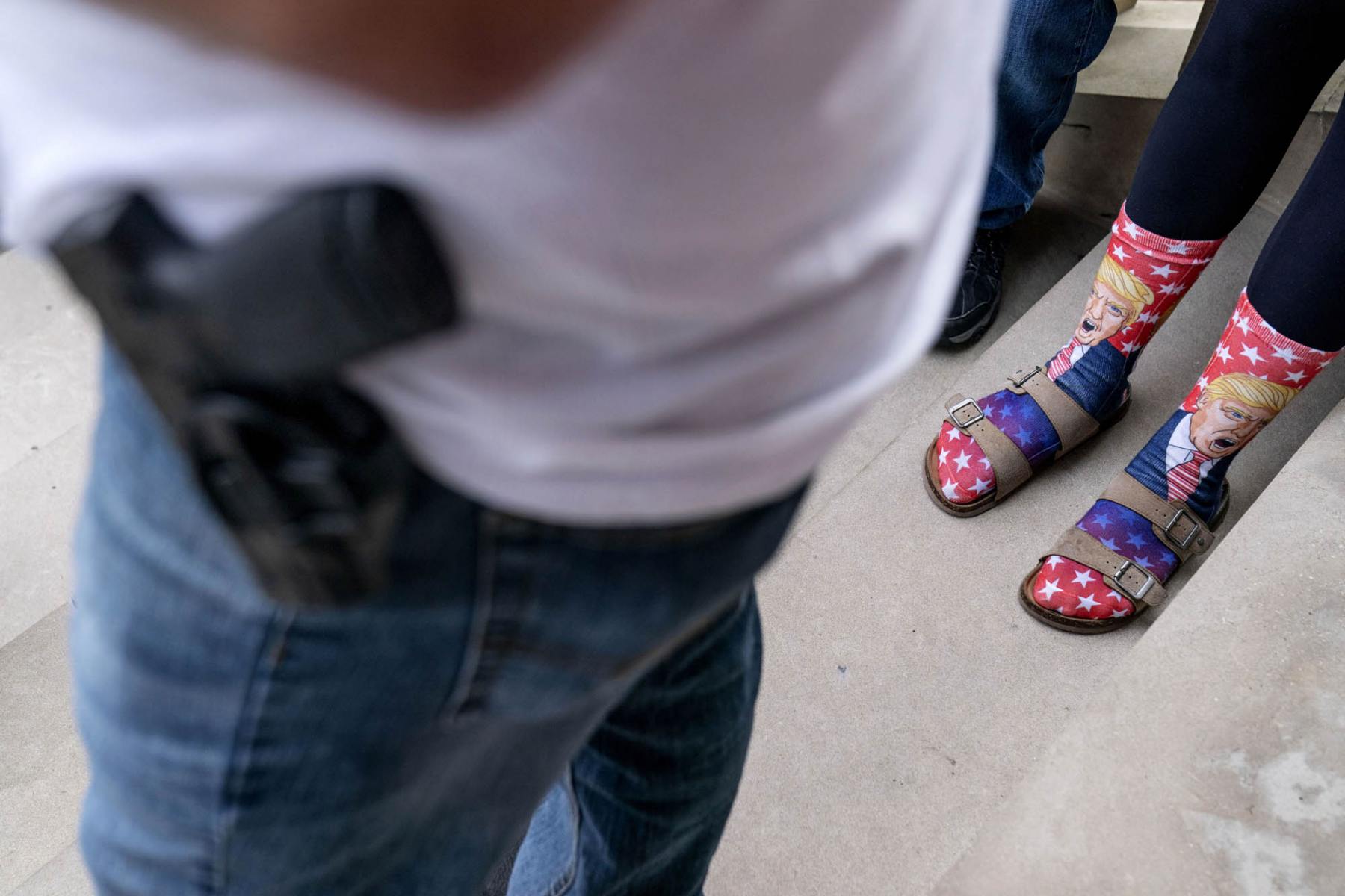 A Trump supporter wears socks bearing the president’s likeness while protesting the presidential election results at the State Capitol in Lansing, Mich., Sunday, Nov. 8, 2020.