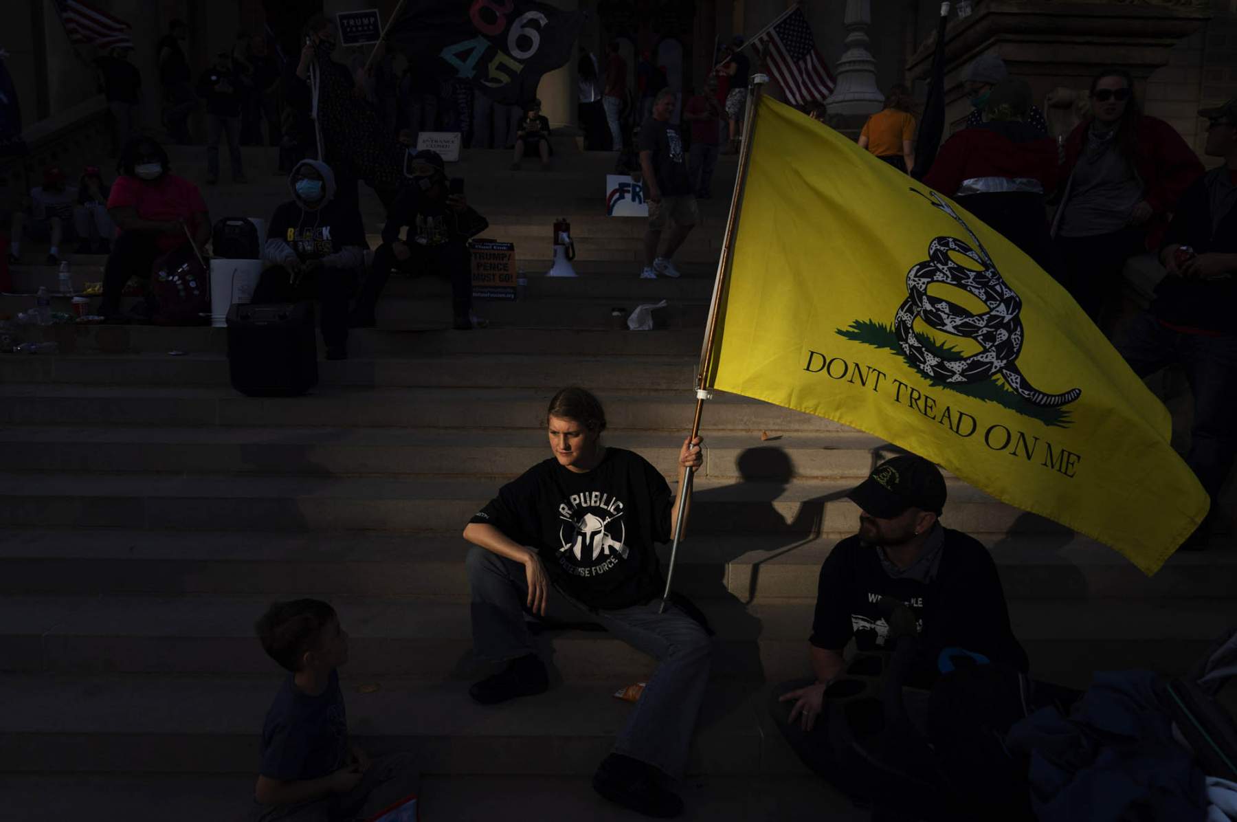 A Trump supporter who would only give her first name, Dianna, sits on the steps of the State Capitol with her husband and two young boys as a protest against the presidential election results winds down in Lansing, Mich., Sunday, Nov. 8, 2020. Dianna believes the election was stolen from President Donald Trump and in numerous conspiracy theories on politics to recent pandemic vaccination efforts.