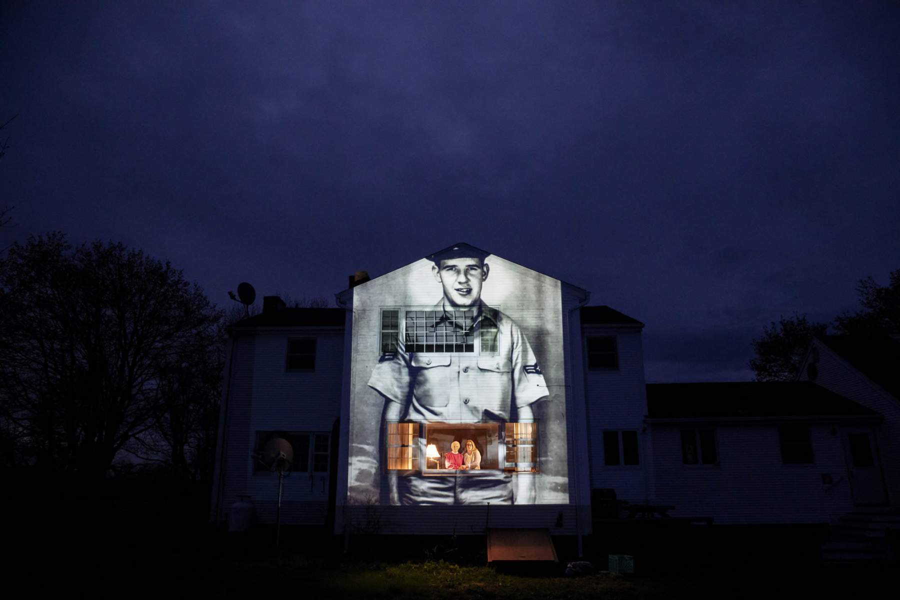 Each of their stories was different, but common strains repeat: Of humility and generosity; of finding joy in the unpretentious; of a sharp mind disappearing into fog or a hale body betrayed by age. And, of service, in war or in peace, that often went unspoken when they returned home. In their final years, these veterans found their place at the Holyoke Soldiers’ Home in Massachusetts. And in their final days, as the coronavirus engulfed the home and killed more than 70, they found battle again. Seeking to capture moments of private mourning at a time of global isolation, the photographer used a projector to cast large images of veterans on to the homes as their loved ones are struggling to honor them during a lockdown that has sidelined many funeral traditions. An image of veteran Charles Lowell is projected onto the home he shared with his wife, Alice, for 30 years as she stands at left with her daughter, Susan Kenney, in Hardwick, Mass. Saturday, May 2, 2020. Lowell, a U.S. Air Force veteran and resident of the Soldier's Home in Holyoke, Mass., died from the COVID-19 virus at the age of 78. Lowell, 78, was a missile guide technician and an IBM operations manager. Along the way, his life was littered with good deeds, the troubled teenager he’d take in, the hungry family he’d help with groceries, done with little notice or unmentioned altogether. “He didn’t tell people things like that,” his daughter Susan Kenney says.